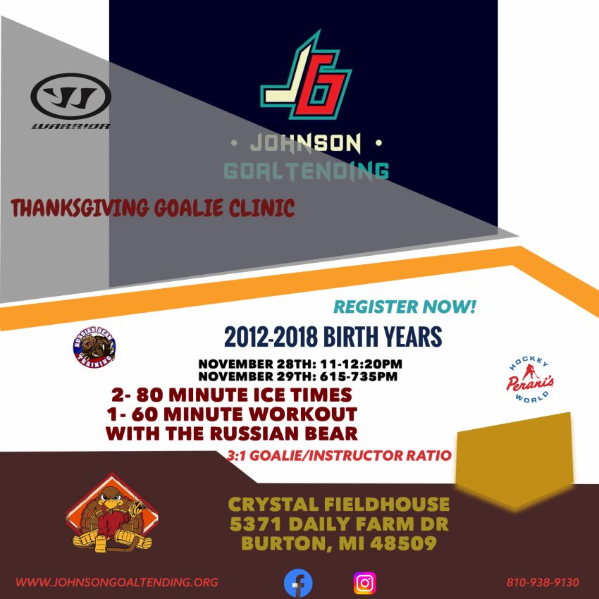Crystal Fieldhouse Thanksgiving goalie clinic November 28, 2025 – November 29, 2025 Crystal Fieldhouse5371 Daily Farms DrBurton, Michigan 485098107440800View LocationMap Crystal Fieldhouse iCal Google Calendar View full calendar Register 11 tickets remaining. ChildAdd oneRemove one$190.00 Add to Cart
