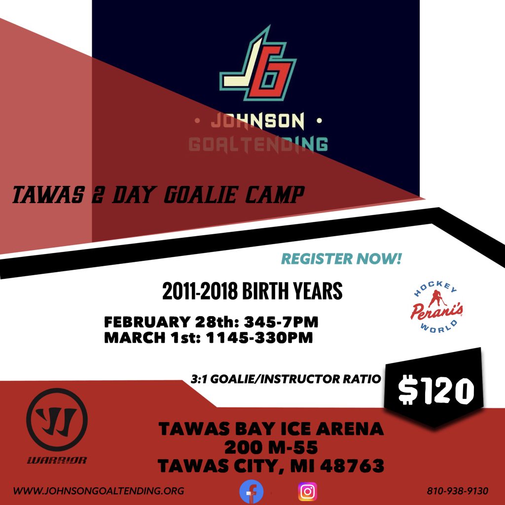 Upcoming Camps and Clinics Upcoming Camps / Clinics 2 Day Tawas Bay Goalie Camp February 28, 2026 – March 1, 2026 Tawas Bay Ice Arena Tawas City, Michigan Details / Register Available Private Sessions